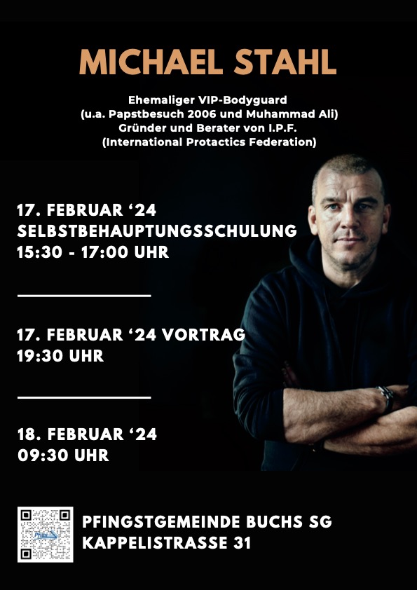 Am Samstagnachmittag dürfen wir von 15:30 bis 17:00 Uhr eine Selbstbehauptungsschulung mit ihm erleben. Dafür ist eine Anmeldung erforderlich info@pfimi-buchs.ch.