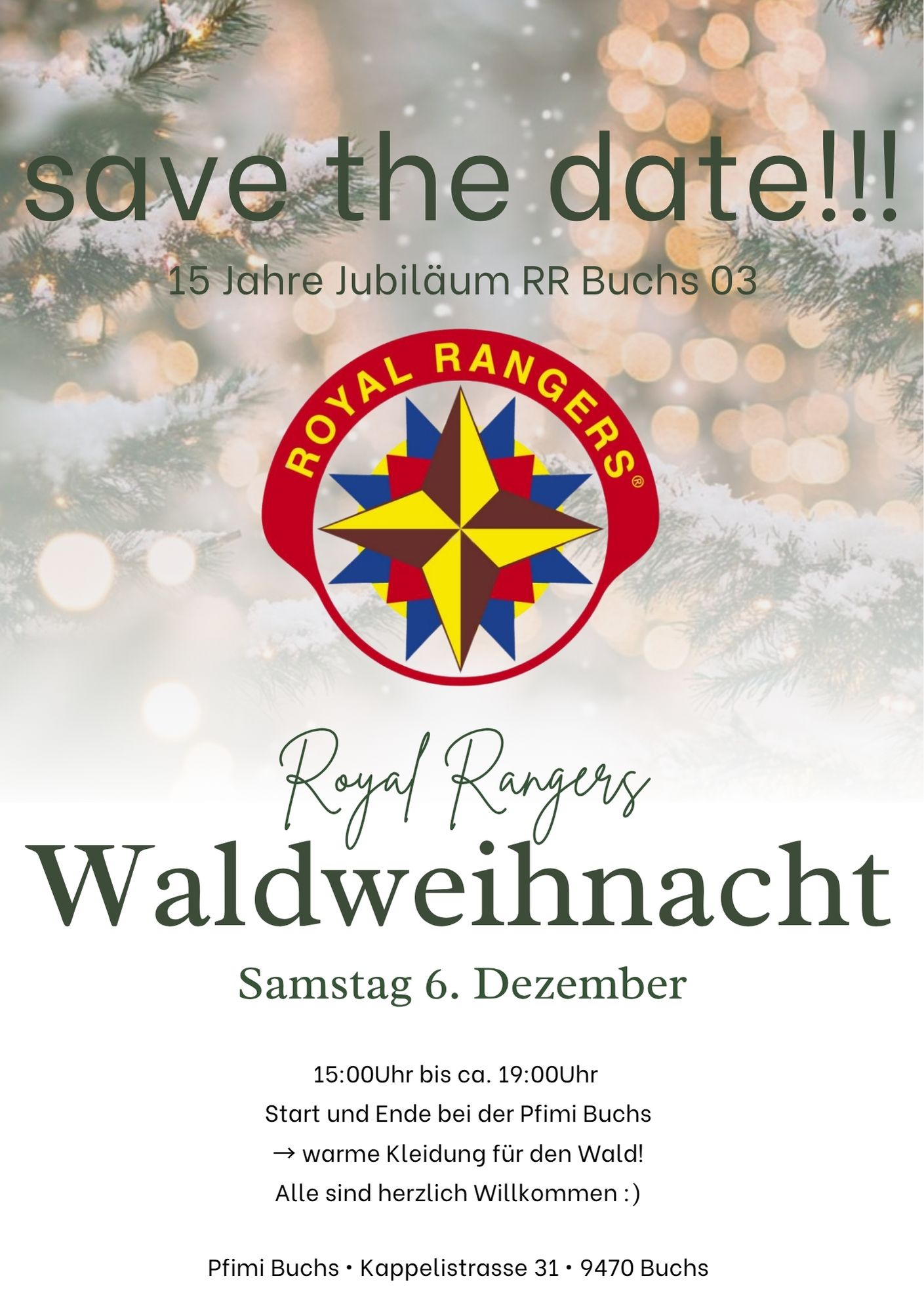 Wir feiern zusammen unsere alljährliche Waldweihnacht und 15 Jahre RR Buchs. Wir singen zusammen, geniessen ein Feuer und einen tollen Input. Wir starten um 15.00 Uhr in der Pfimi, wo wir die meiste Zeit verbringen werden. Später verschieben wir noch in den Wald und werden dort um ca. 19.00 Uhr die Feier beenden. Sei doch auch mit dabei! Anmeldung und weitere Infos siehe Flyer und Homepage. Es sind alle herzlich willkommen!